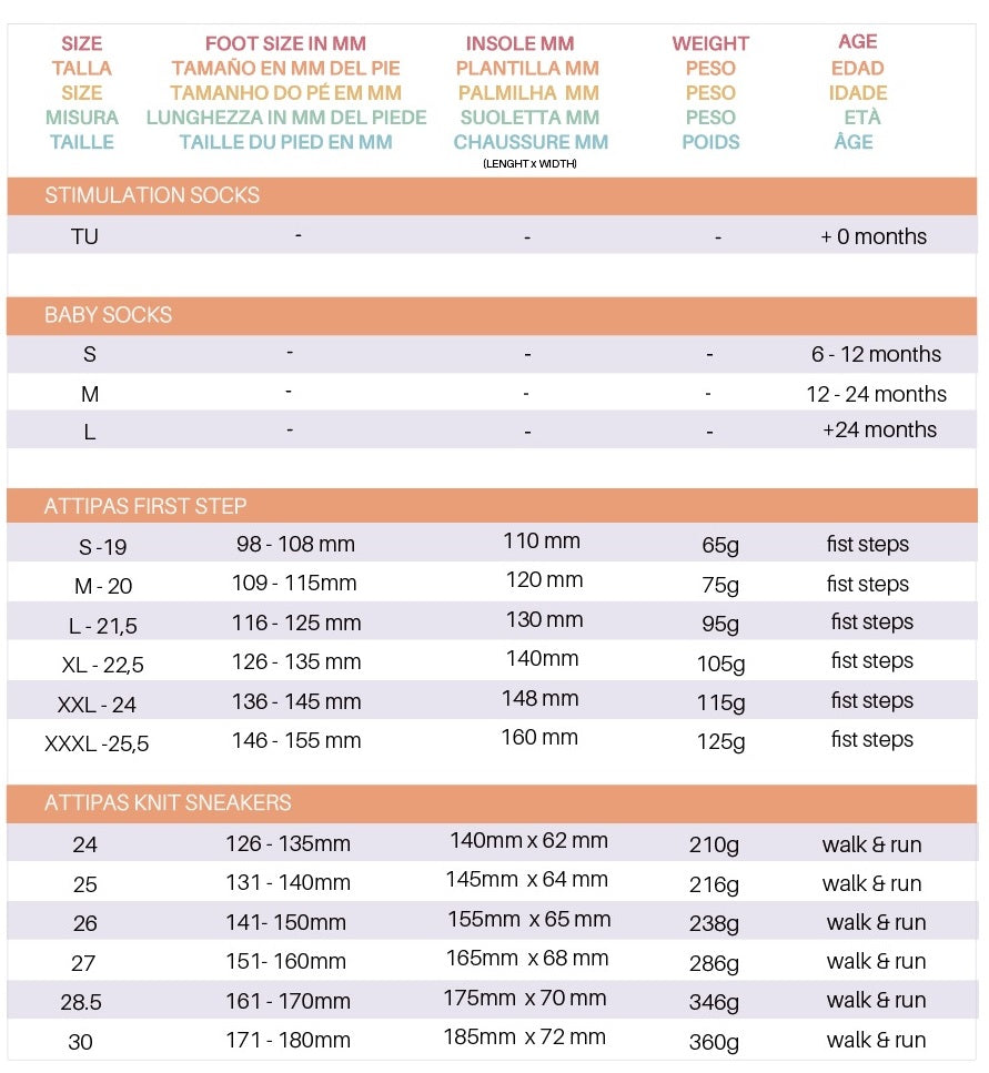 Note que na marca Attipas não é necessário acrescentar folga, a marca já teve em consideração. Os "mm" correspondem ao tamanho do pé.