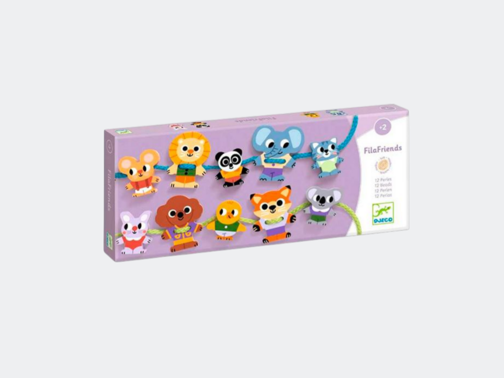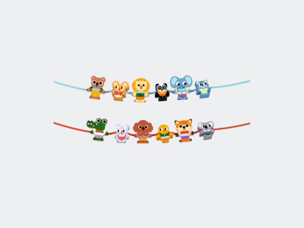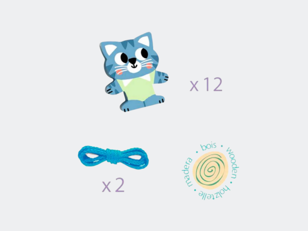 Um jogo que ajuda no desenvolvimento da motricidade fina da criança. A criança vai divertir-se a atar as placas e a enfiar os elementos ilustrados nos dois cordões, dando asas à sua imaginação. Peças grandes fáceis de agarrar pelas mãos pequeninas