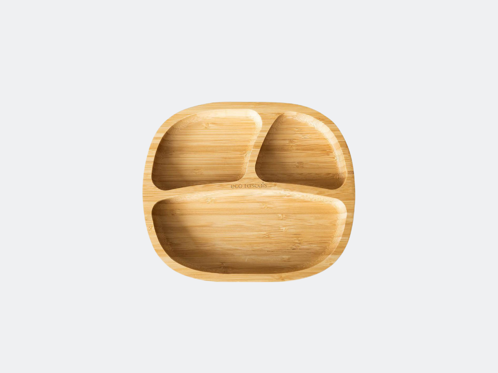 Prato de bambu da Eco Rascals. Graças à sua ventosa, podes colocá-lo onde quiseres e ajustá-lo, evitando que o teu filho ou filha o mova e desperdice a comida. Fabricado em bambu natural, biodegradável, orgânico e cultivado sem pesticidas.