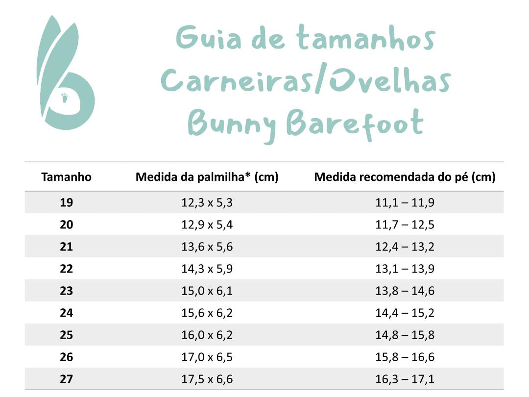 - Aqui tem a tabela que correspende ao calçado da marca Bunny Barefoot, não acrecente nenhuma folga, a marca já teve em consideração!