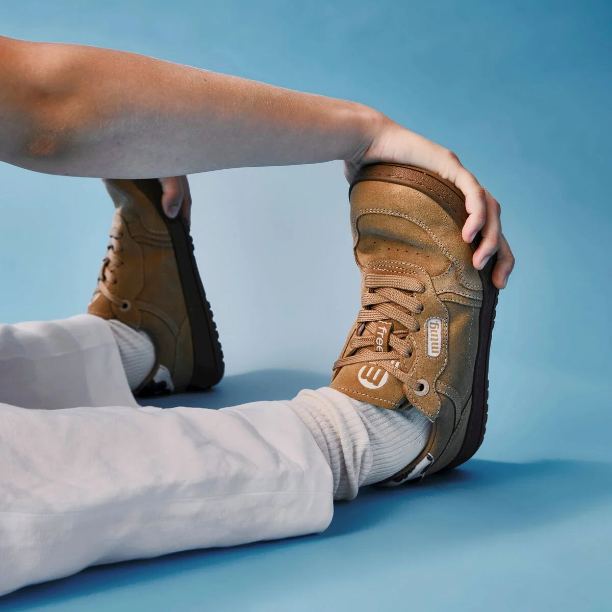 Ténis femininos em pele e camurça, com sola plana e biqueira larga para máximo conforto. Criados em colaboração com o Dr. Juanjo López, apoiam o movimento natural do pé. Um essencial versátil para o dia a dia.