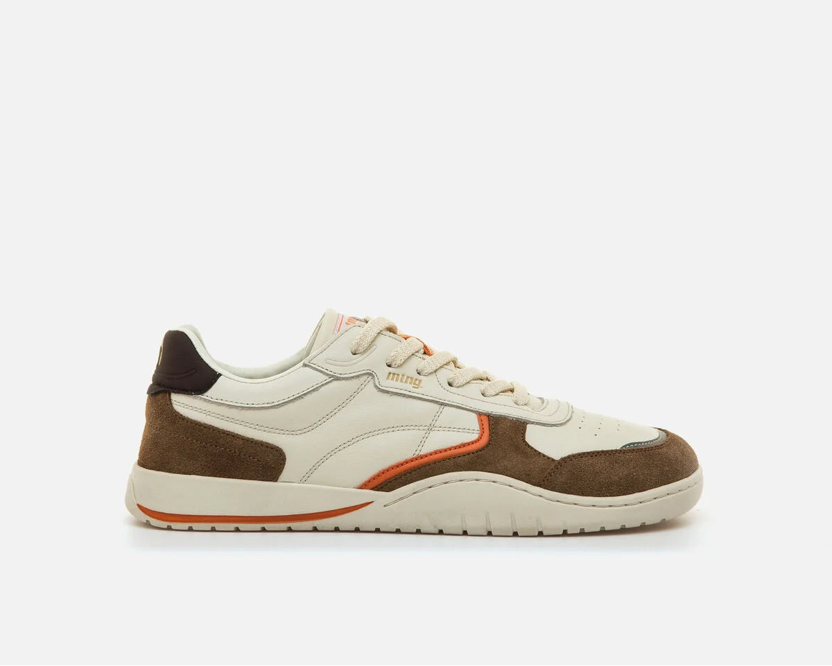 O Ténis Free Orbit é um modelo em pele de cor cru com detalhes em castanho para homem, da marca MTNG. O design combina painéis com texturas e tons diferentes, reforços em zonas estratégicas e detalhes em laranja para um toque desportivo. A biqueira ampla, a sola totalmente plana (zero drop) e a flexibilidade favorecem a anatomia do pé e uma postura saudável.